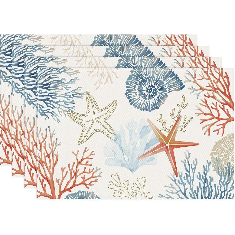 Bonhause Nautical Coastal Placemats Set of 4, 12x18 Inch Ocean Themed Starfish Coral Beach Kitchen Dining Table Mats Washable Place Mats for Indoor