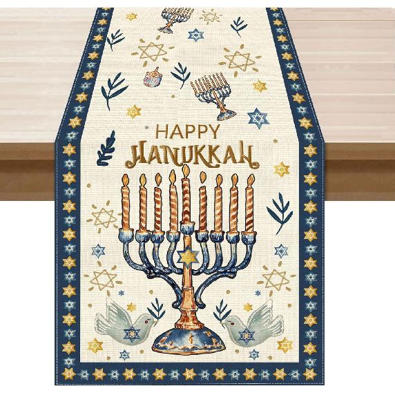 XCHI Happy Hanukkah Chanukah Menorah Six-Pointed Star Doves Table Runner Table Decoration for Party Home Kitchen Dining Holiday Decor 13x72 Inch