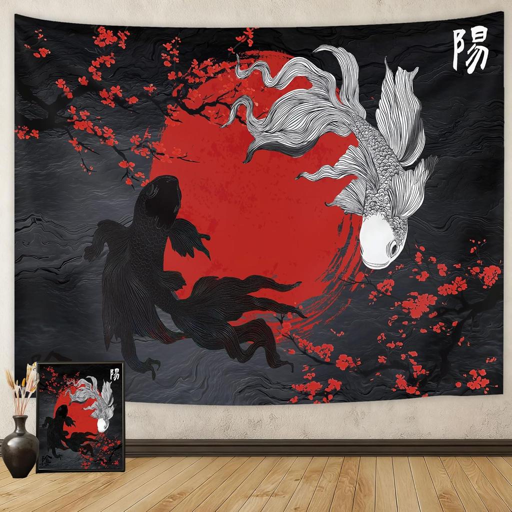 Raoycla Japanese Anime Tapestry, Red and Black Yin Yang Koi Fish Tapestries, Cherry Blossom Cool Asian Mens Masculine Art Tapestry Hanging for