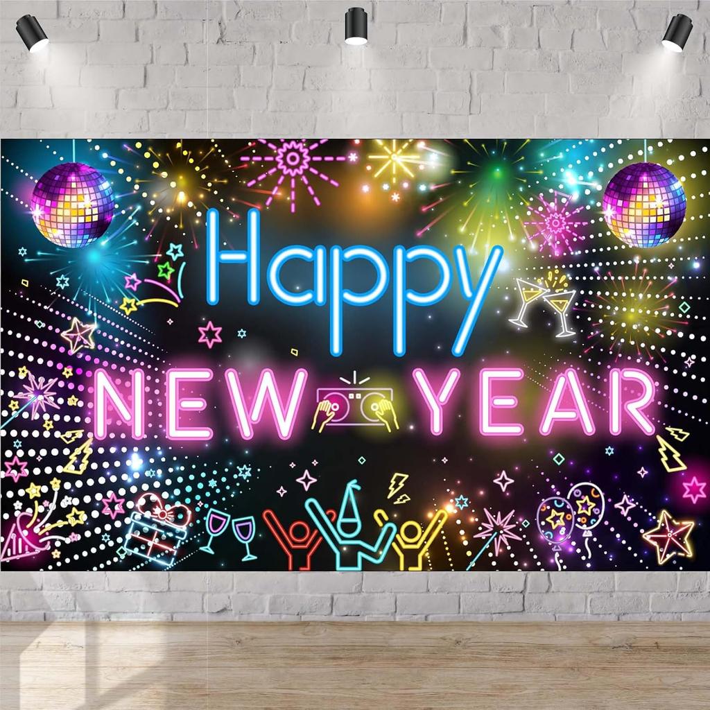 Neon Happy New Year 2026 Banner - Large Colorful Disco Theme Party Backdrop with Hanging Rope - New Years Eve Party Supplies 2026 - Holiday Photo