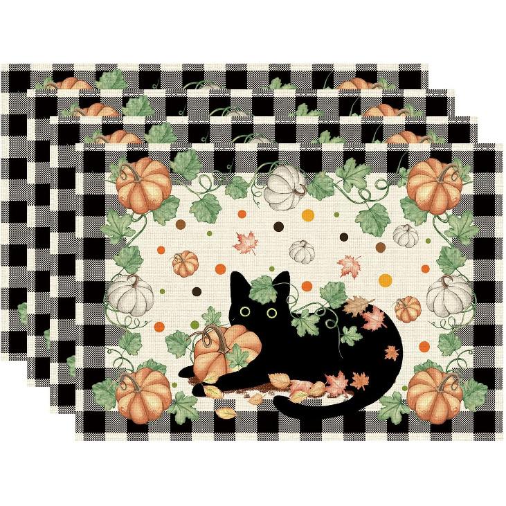 XCHI Fall Black Cat Pumpkin Plaid Placemats Set of 4 Table Mats for Party Home Kitchen Dining Table Decorations 12x18 Inch