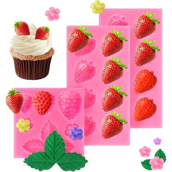 3 Pcs Strawberry Mold 3D Baking DIY Silicone Fruit Fondant Chocolate Mold for Cupcake Shortcake Cake Topper Decoration Candy Jelly Clay