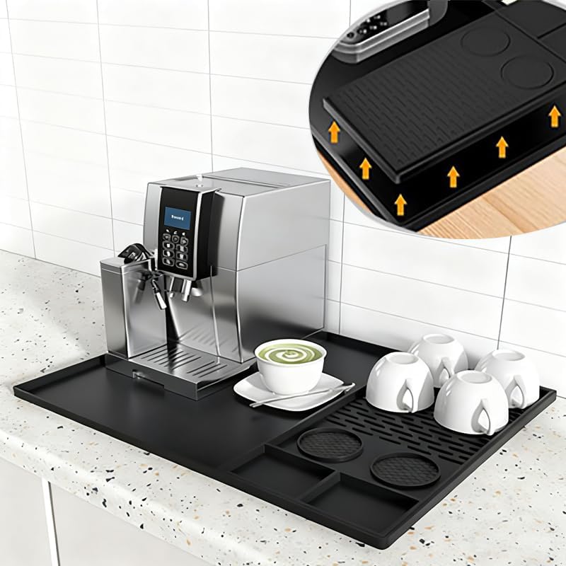 Silicone Coffee Maker Mat is 24" x 16" silicone coffee matt for counter offers ample space for your coffee station accessories, grinder, and coffee machine - reducing countertop clutter and keeping everything in one place while protecting your surfaces from spills and scratches.