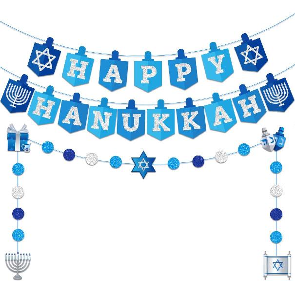 Hanukkah Decorations Banner, Pre-assembled Hanukkah Party Decor Garland, Happy Hanukkah Sign Banner, Chanukah Decorations for Home, Blue Glitter