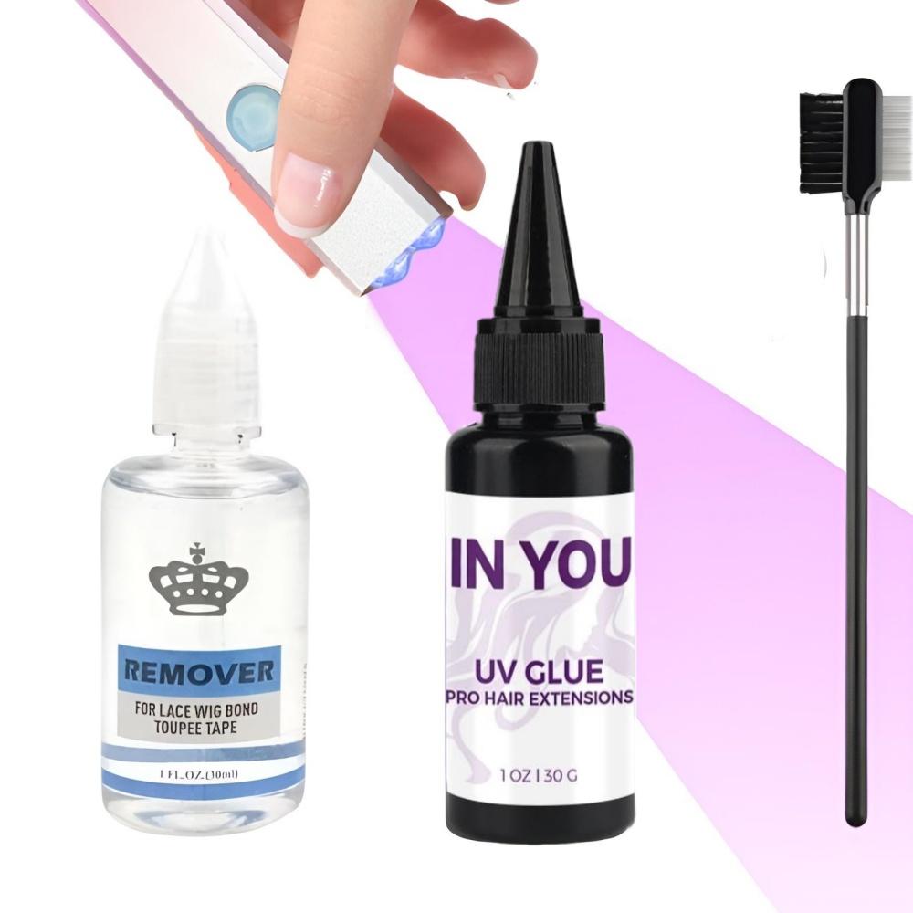 Content: ultraviolet light (with charging cable), hair extension comb, wig glue, glue remover, heat insulation sheet, finger sleeve, needle, hairpin