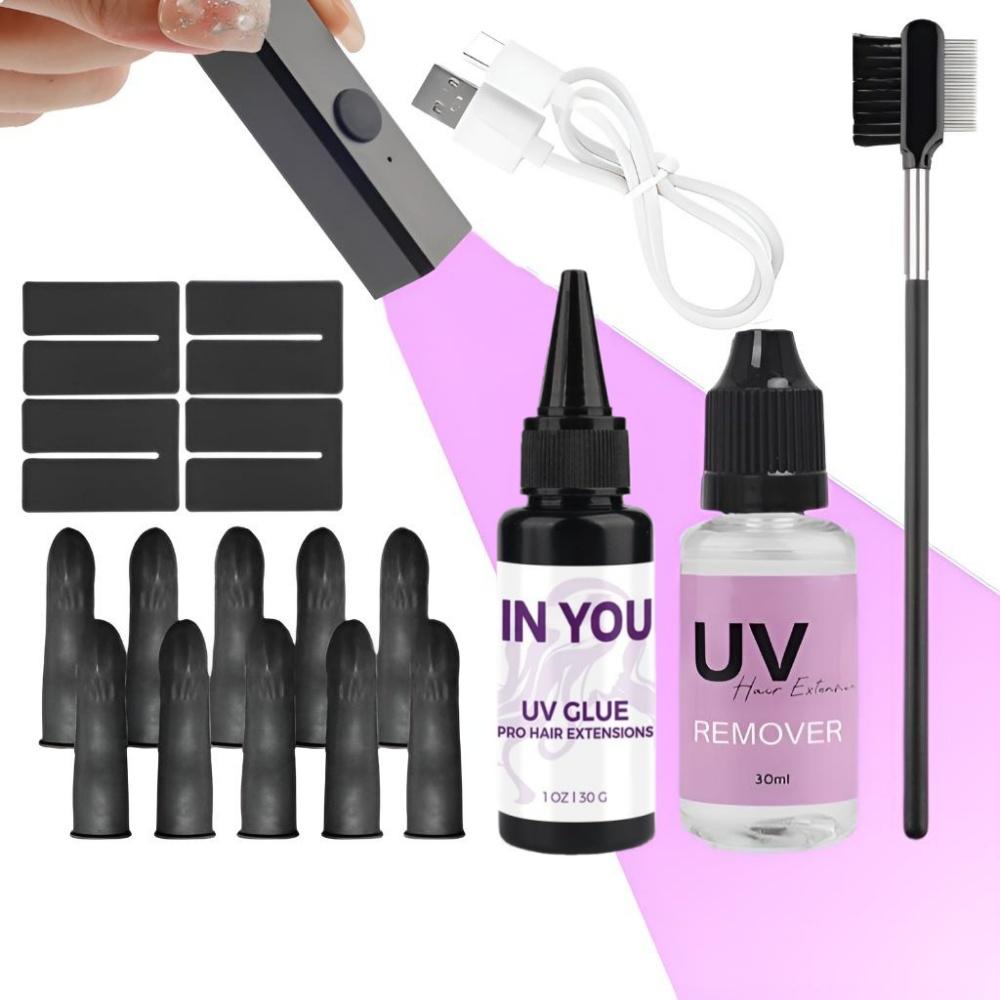 Content: ultraviolet light (with charging cable), hair extension comb, wig glue, glue remover, heat insulation sheet, finger sleeve, needle, hairpin