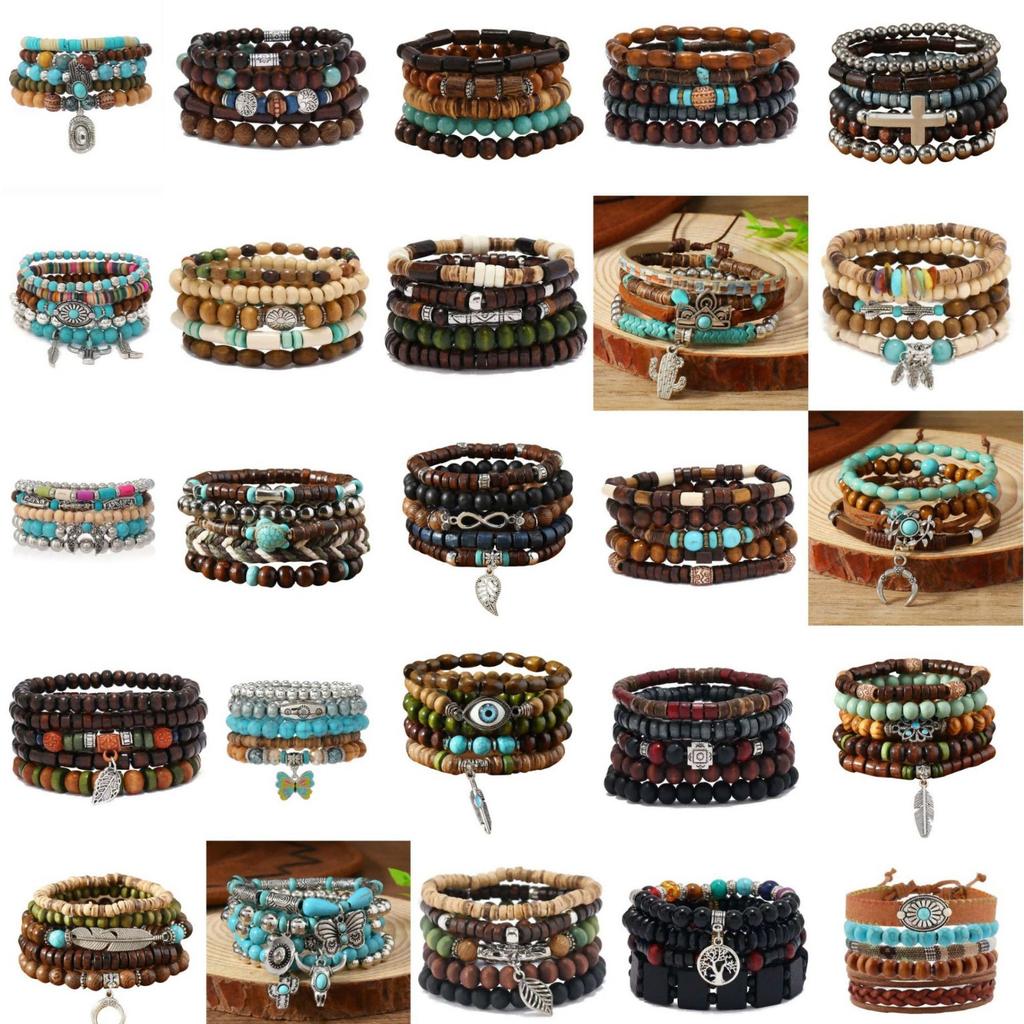 European, American Peace Tree Multi-piece Wooden Bead Beaded Bracelet Retro Simple Men's Personality Stacked Bracelet