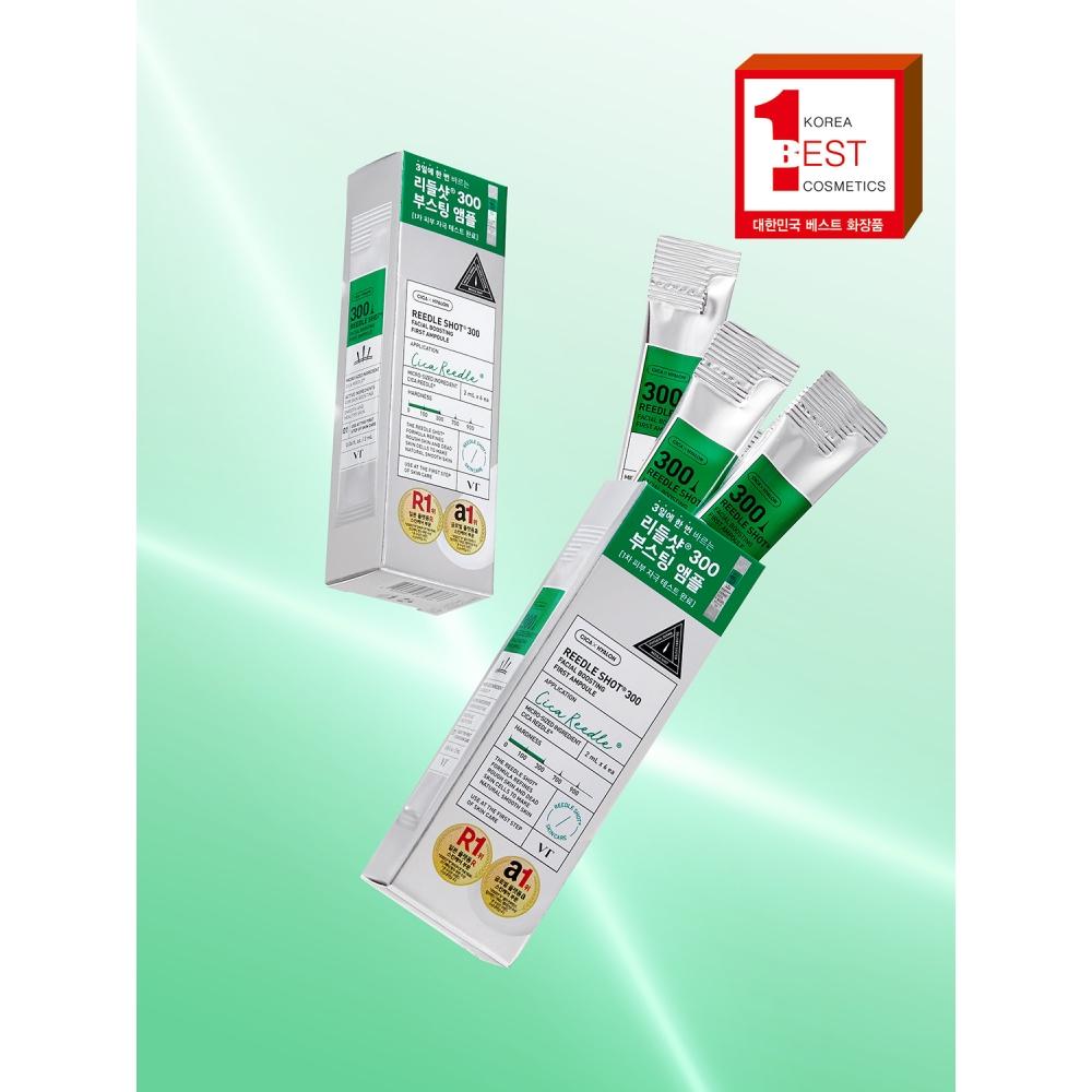 VT Riddle Shot 300 Facial Boosting First Ampoule 2ml*6 pieces contains micro-sized needle ingredients that are 14 times thinner than pores, providing skin stimulation and absorption enhancement. This product is suitable for all skin types and effectively maximizes the efficacy of cosmetics applied afterward by boosting absorption.