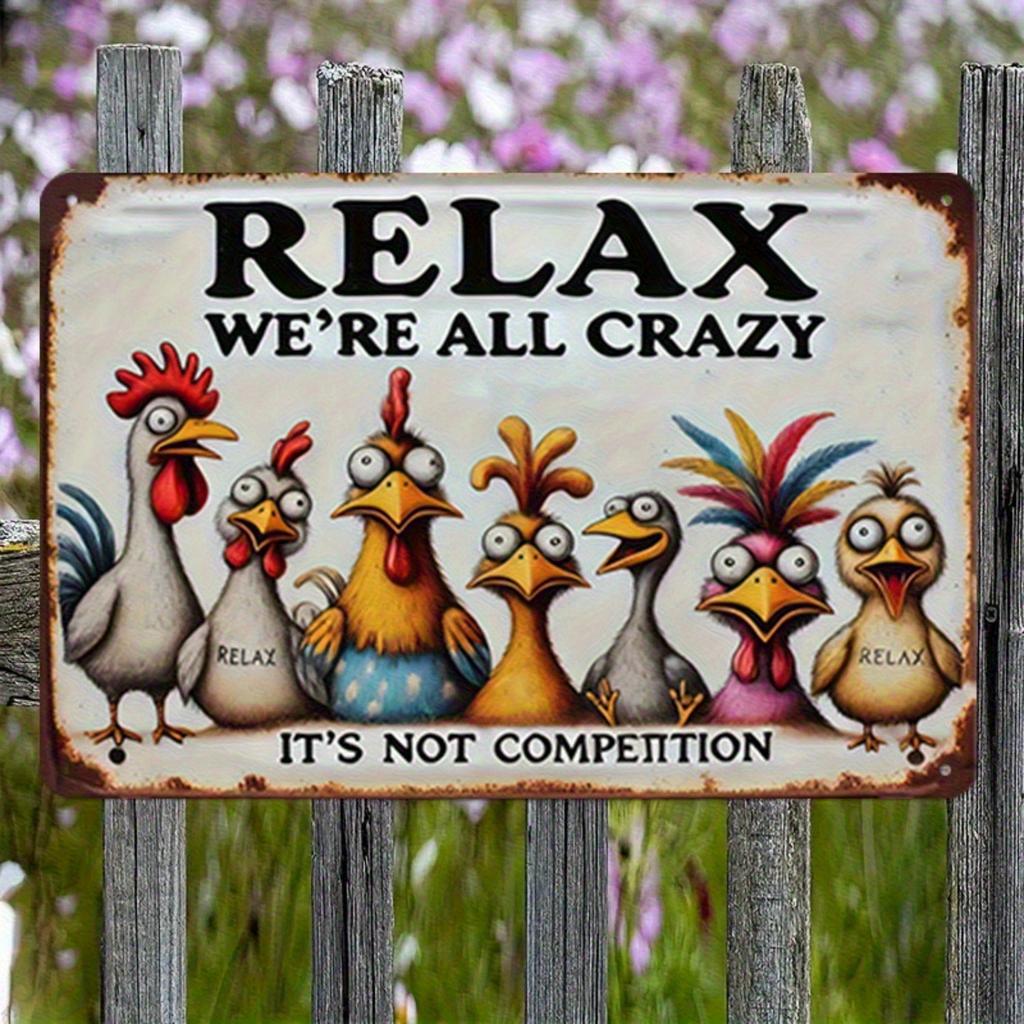Funny Chicken Coop Sign Relax Were All Mad Retro Iron Metal Wall Decoration with Cartoon Hen Pattern Country Style Ind