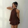 Women's Vacation Slim Fit Sexy Open Back Pendant Tie Waist Ruched Top with Bubble Skirt Dress