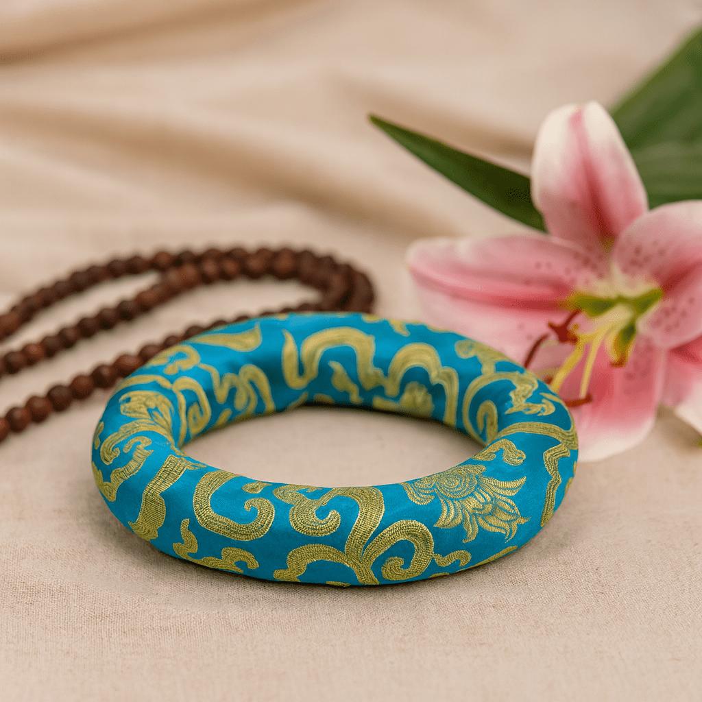 Crafted in Nepal, the even, rounded profile supports the bowl’s weight and prevents contact with hard surfaces, reducing buzz and rattle so tones remain clear and true. The smooth, lustrous fabric—seen here in turquoise with delicate gold brocade—adds a gentle touch under the hand and a quiet glow to your altar or practice space. Many pieces carry stylized floral and foliate scrolls, motifs common in Himalayan textiles; they are often appreciated as symbols of growth, continuity, and natural harmony, a calm reminder during meditation. 🌿
