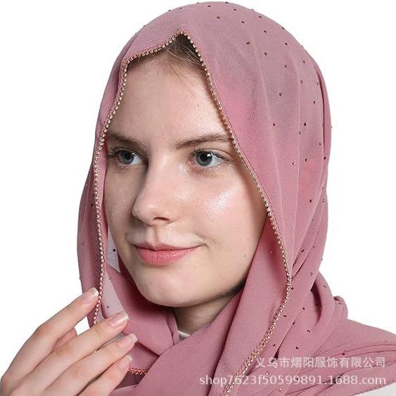 Fashion Hot Sale High-Quality Pearl Chiffon Rhinestone Chain Scarf Shawl Muslim Women Hijab Ethnic Headscarf