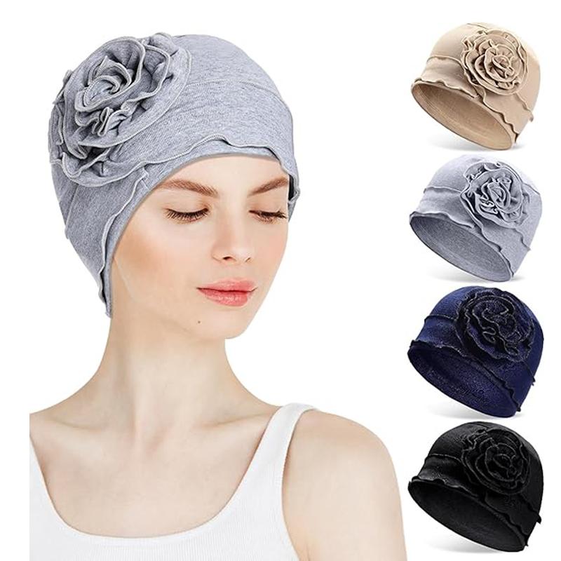 New Elegant Women Solid Color Flower Cuffed Turban Hat Soft Cancer Chemo Head Scarf Hats Beanie Cap Elastic Covers Wraps