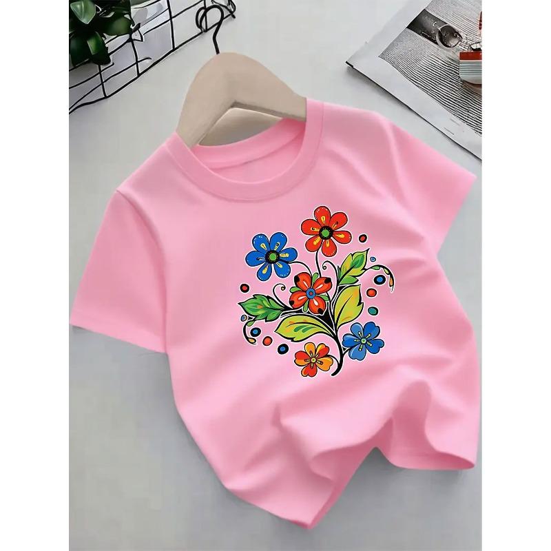 European sizes Short Sleeve Summer Cartoon Flower Pattern Casual Top for Girls – Soft Medium Stretch Knit Crew Neck Tee, Comfortable Everyday Wear,