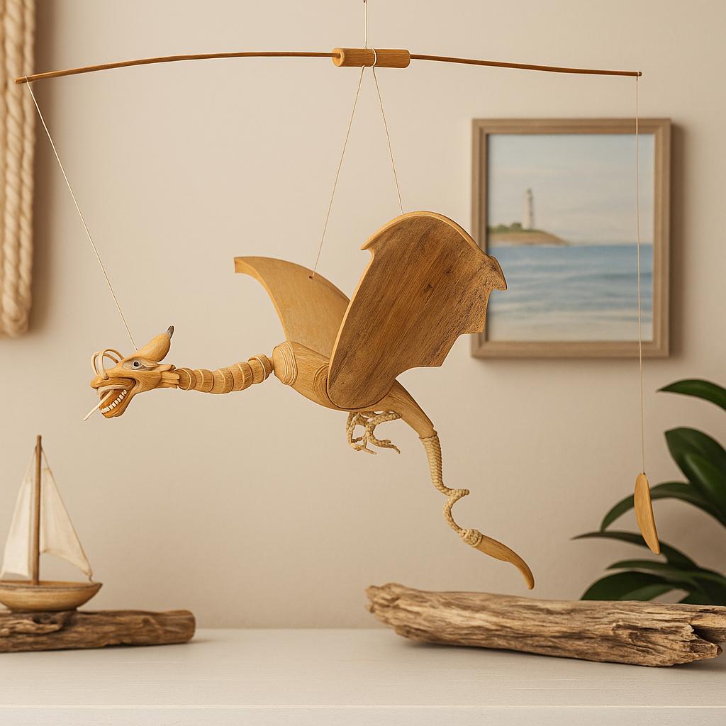 Hand-carved from natural wood and coconut shell, the dragon’s elongated body, scalloped wings, and wrapped-fiber details invite the eye and the hand. Suspended from a curved wooden hanger with a small counterweight, it settles into a gentle, airy motion with the slightest movement — adding depth and softness to a wall without crowding it. The vertical lines feel grounding and balanced, anchoring a corner, entryway, or reading nook. Its earthy grain and light twine suit bohemian layers, rustic textures, and modern minimal rooms alike. 🌿