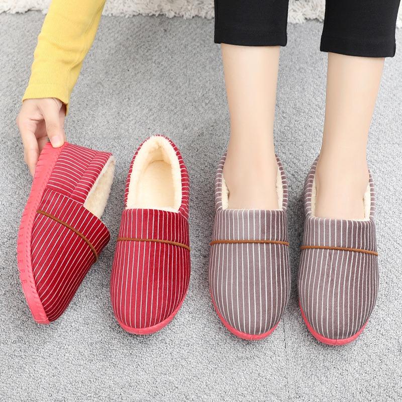 New striped round head low top, comfortable to wear outside, winter velvet soft sole flat heel casual warm women's cotton shoes