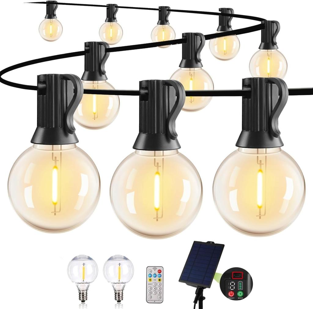 [New for 2026] Solar-Powered Outdoor String Lights, IP65 Waterproof, USB Rechargeable, Automatically Turns On at Night, 15m, 25 LED Bulbs, G40, E12 Base, Warm White, PC Material, Break-Resistant, 8 Lighting Modes, Dimmable, Timer Function, Remote Control, Battery Level Indicator, Indoor/Outdoor Lighting, Birthday, Christmas, Garden Lighting, Yard, New Year's, Festival, Wedding Decoration, Outdoor Illumination