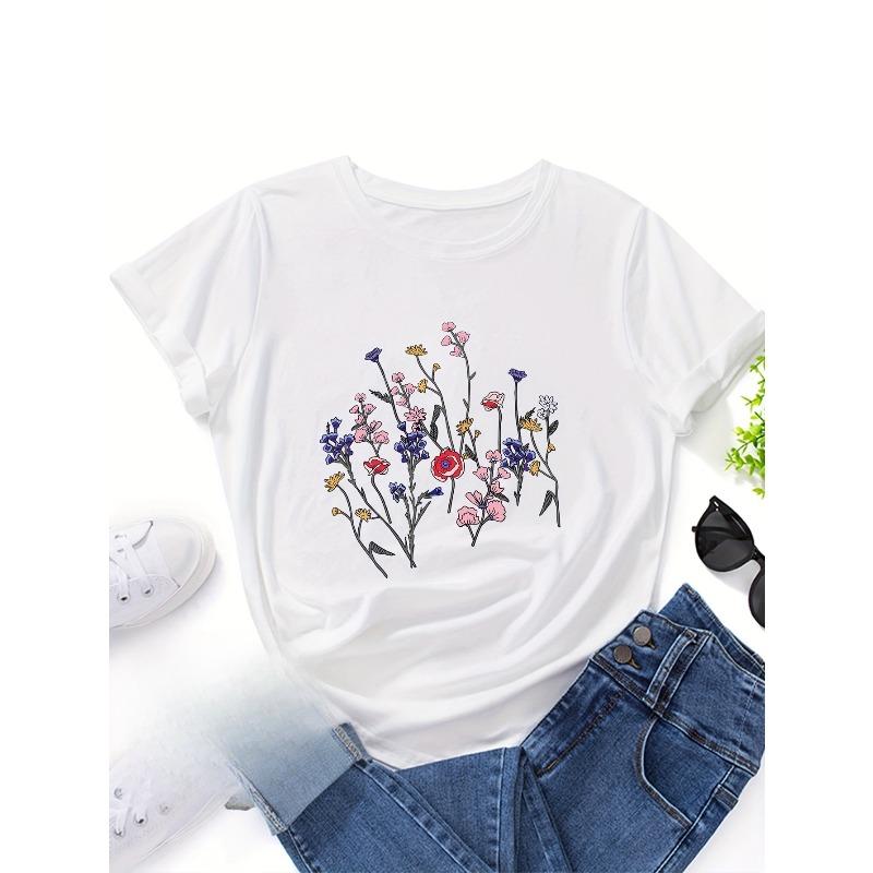 European sizes European Size Women'S Floral Print T-Shirt - Soft Breathable Crew Neck Short Sleeve Top, All-Season Casual Summer Tee