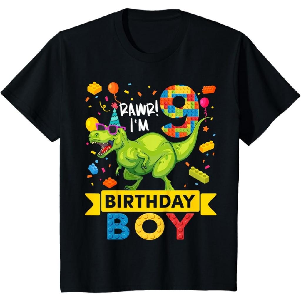 Kids 9 Year Old Dinosaur Building Blocks 9th Birthday Boy T-Shirt