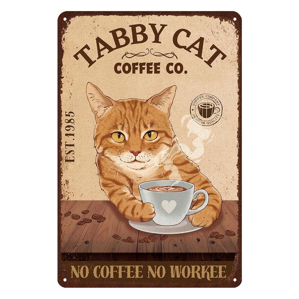 Vintage Tabby Cat Coffee Co Metal Sign Retro Wall Decor with No Coffee No Workie Quote Iron Wall Hanging for Bedroom or