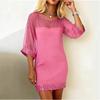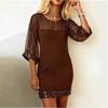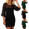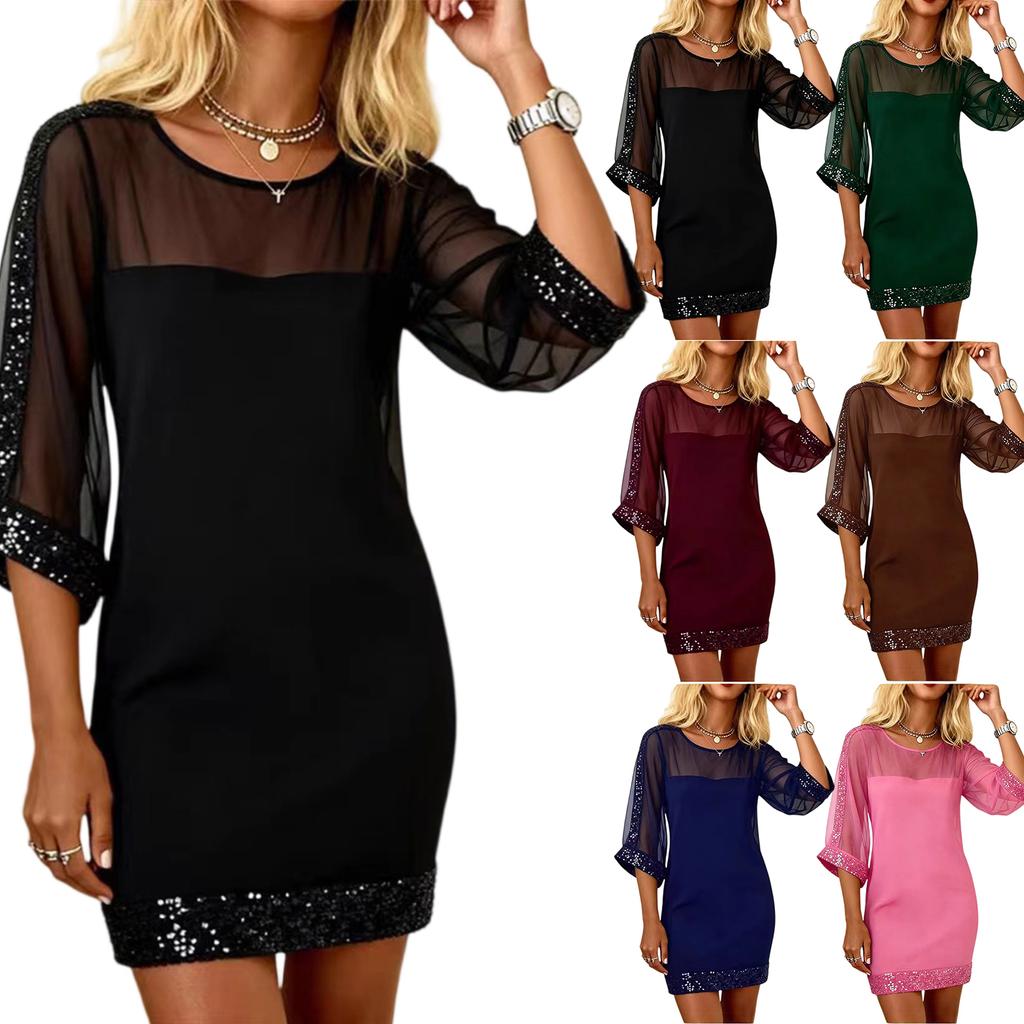 Women's Fashion Stitching Mesh Sequins Round Neck Sexy Slim-Fit 3/4 Sleeve Dress