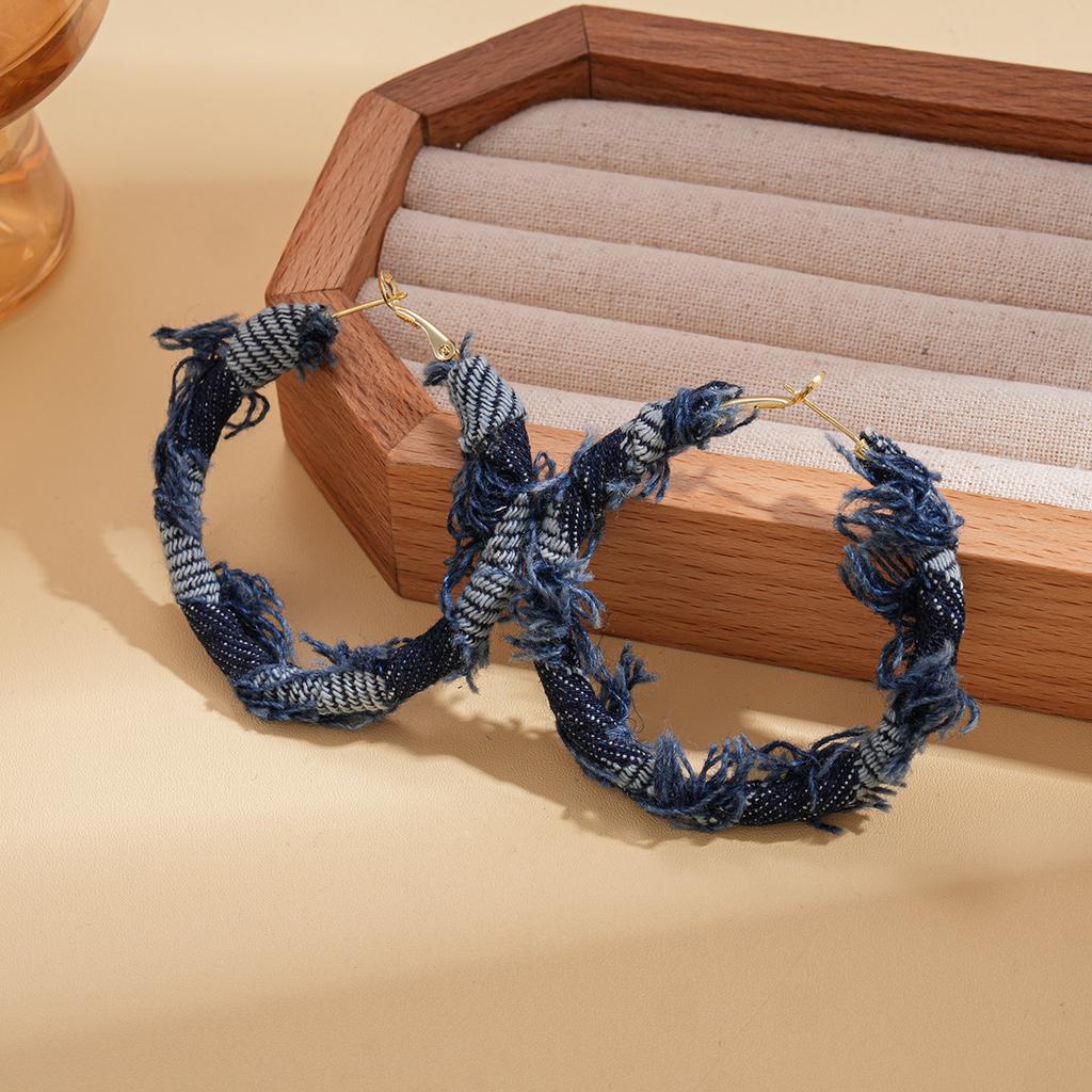 European and American fabric denim woven autumn and winter geometric round silver needle earrings niche retro personalized earrings
