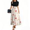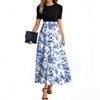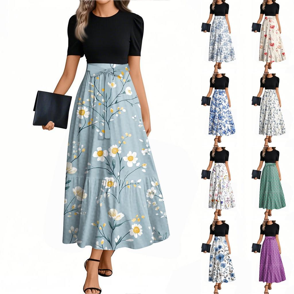 Women's Fashion Casual Belt Short Sleeve Round Neck Floral Stitching Elegant Temperament Dress