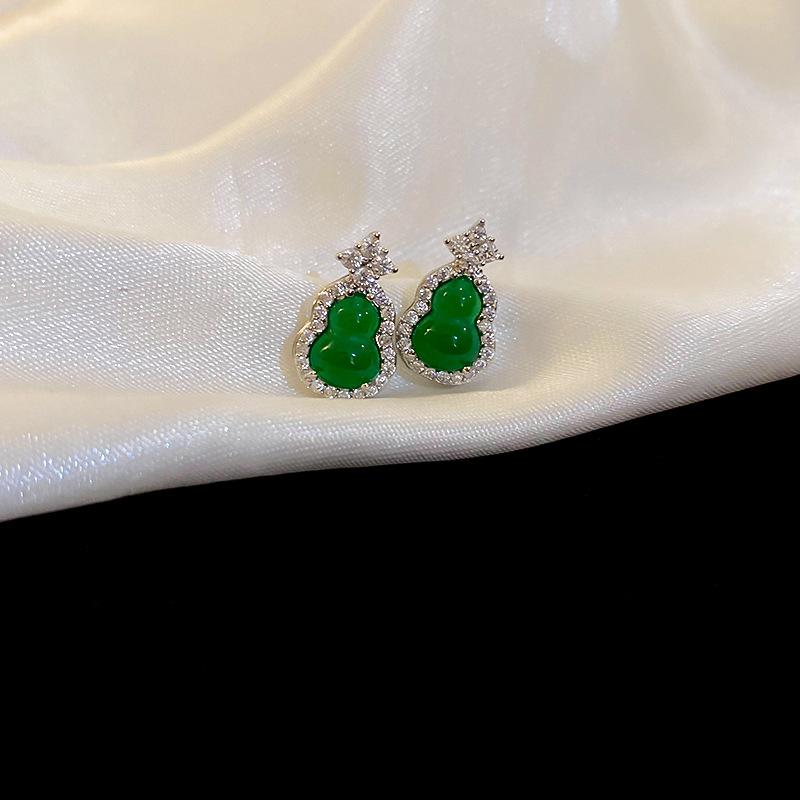 New Chinese small zircon green gourd silver needle earrings Chinese style simple niche high-end earrings