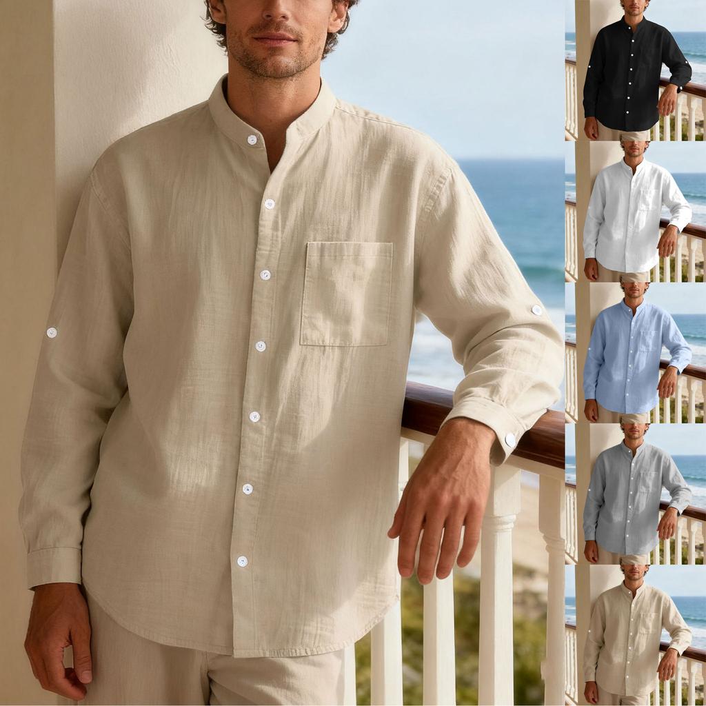 New Spring/Autumn Linen Long-Sleeved Men's Shirt Casual Beach Holiday Stand-Up Collar Commuter Shirt