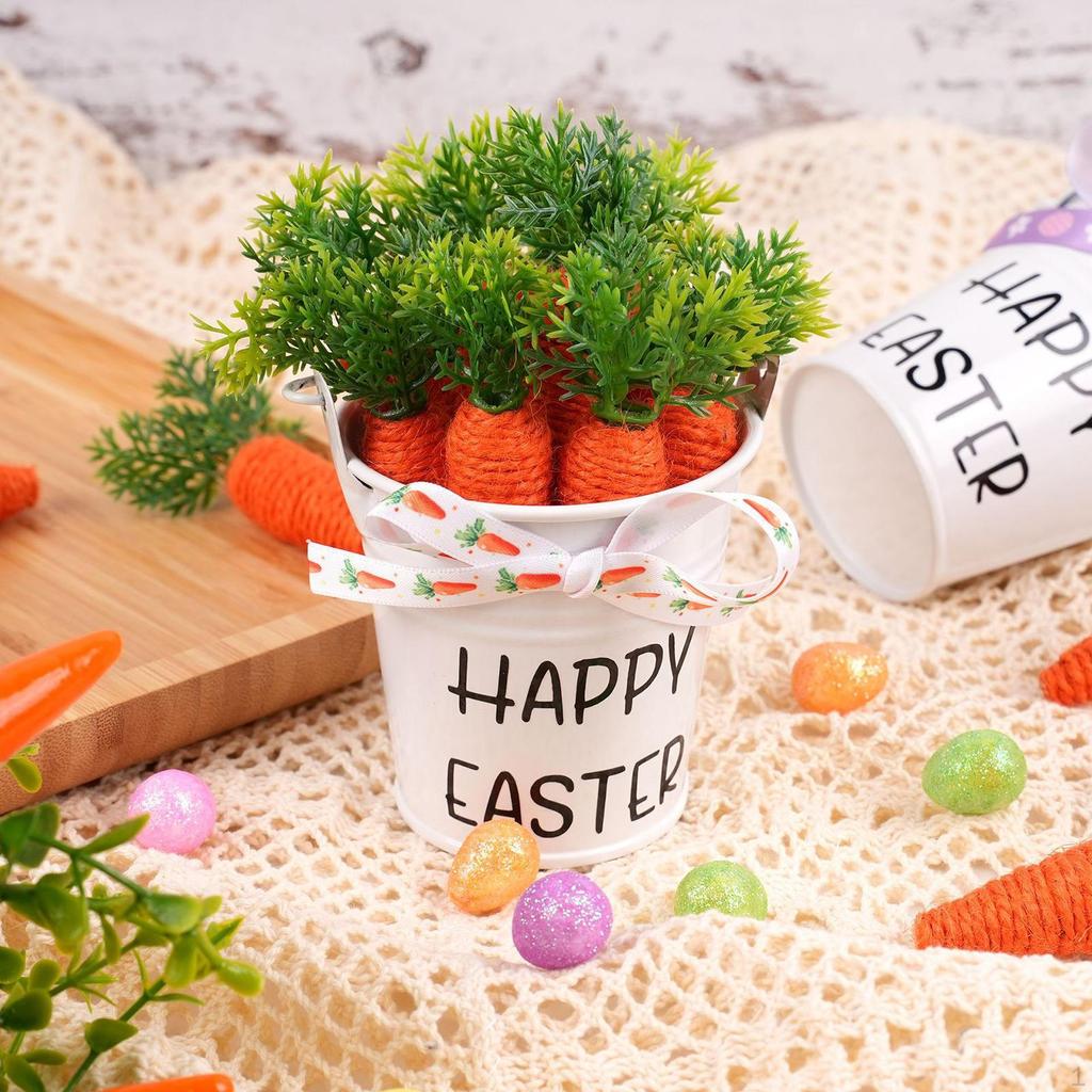 - 【Festive decor】Easter Basket Features a vivid Easter theme with "Happy Easter" lettering, Includes a metal bucket filled with simulated carrots and lifelike green leaves, each adorned with a charming bow