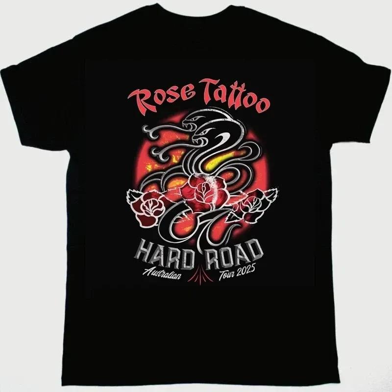 Retro Rock Band Tee; Rose Tattoo Style 2025 Graphic Black Unisex T-Shirt
