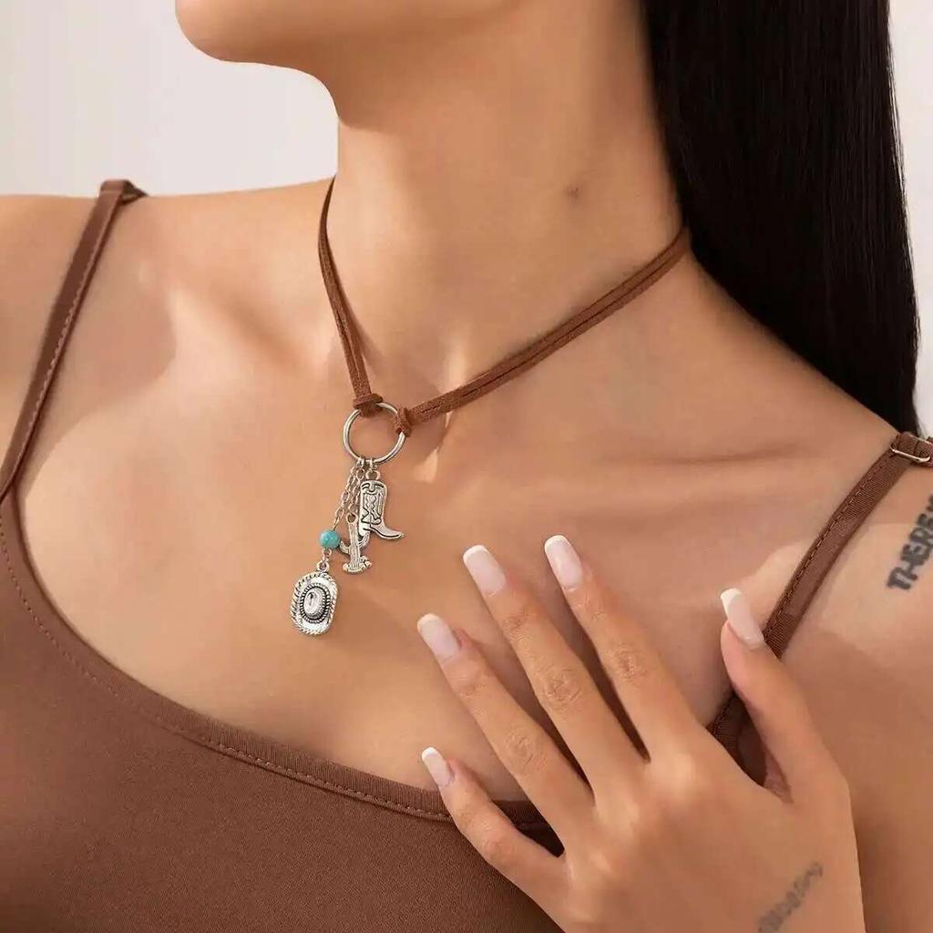 Salircon Classic Cowboy Hat Cactus Boots Pendant Necklace for Women Vintage Charm Velvet Rope Choker Jewelry Gift New