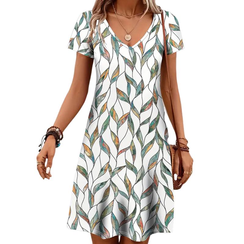 Casual Well-Fitted Printed Short Dress For Women Summer Elegant And Retro Lady's V-Neck Short-Sleeved Straight Knee-Length Dress