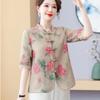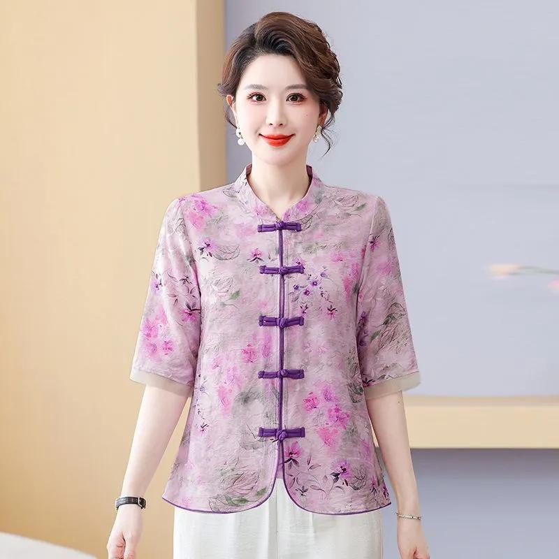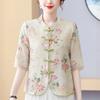 Kadın Çin Tarzı Çiçek Baskılı Bluz Kurbağa Düğmeli 3/4 Kol Günlük Üst