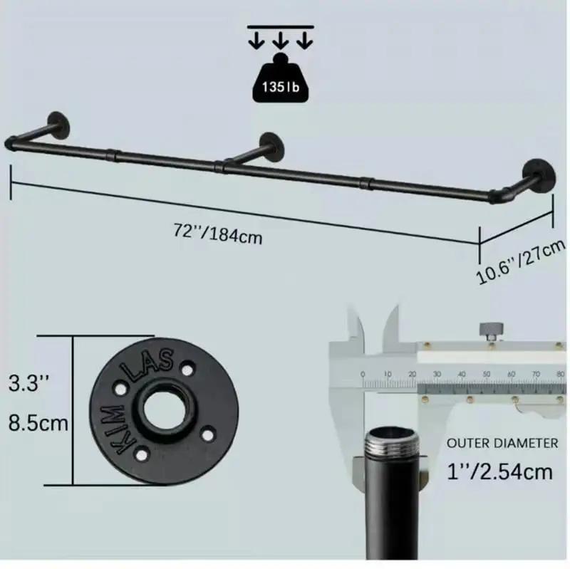 180cm Bedroom Garment Home Rail Multipurpose Wall Mounted Industrial Pipe Clothes Rack Space Saving Hanging Shelf with 3 Hooks