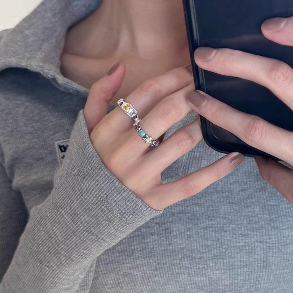 Korean colored flower dripping oil special-shaped love diamond sparkling gemstone ring opening adjustable personalized ring