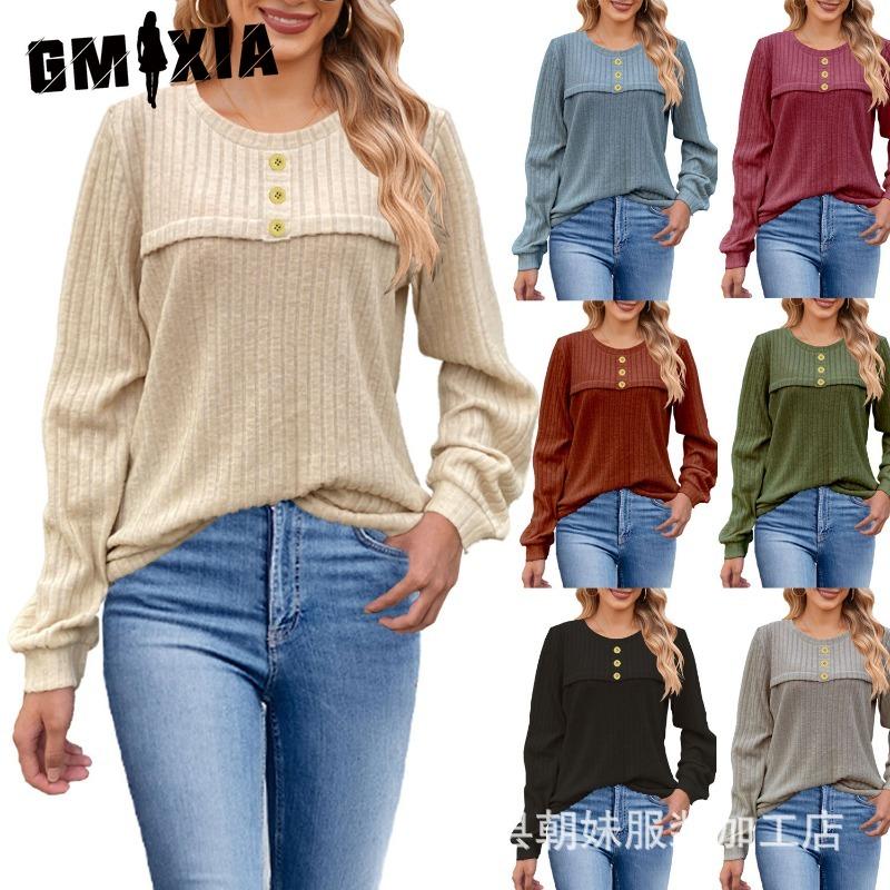GMXIA Kadın Modası Günlük Düz Renk Desen Uzun Kollu O Yaka Bluzlar ve Gömlekler