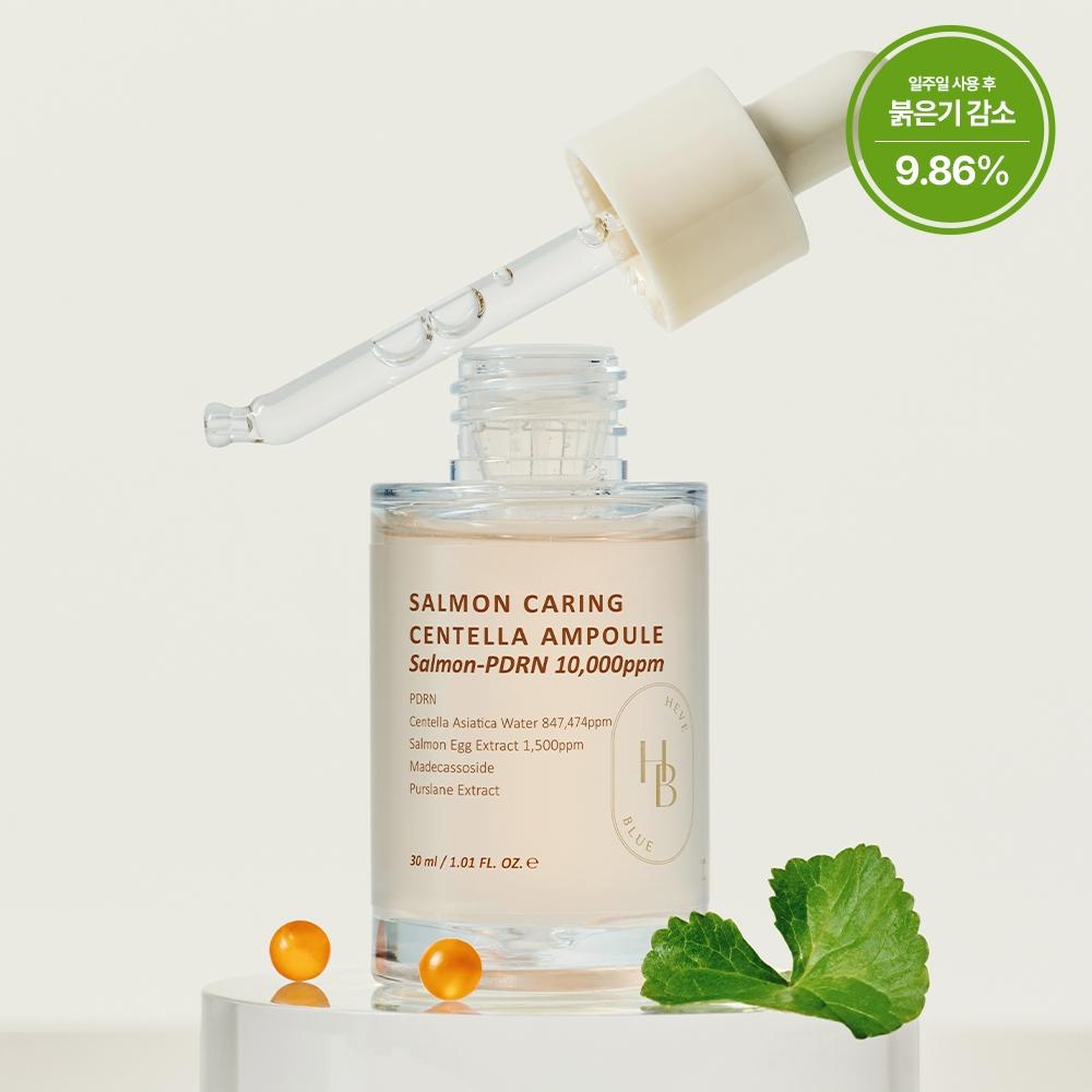 Heveblue Salmon PDRN Caring Centella Ampoule 30ml is an intensive calming product for sensitive skin. This ampoule absorbs quickly without stickiness and effectively calms the skin without irritation. Featuring PDRN and Centella, it provides protective and soothing effects suitable for all skin types.