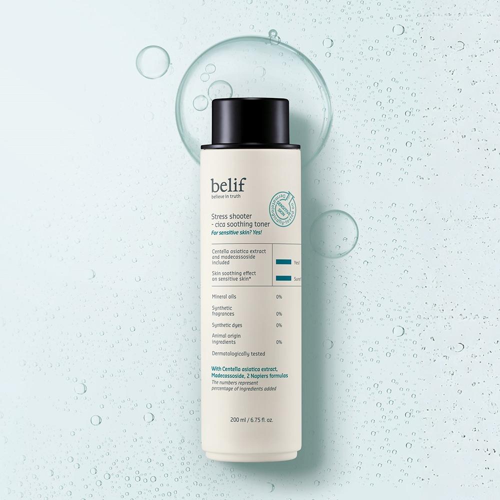 Belif Stress Shooter Cica Soothing Toner 200ml is an exceptionally calming toner suitable for all skin types. This product contains soothing ingredients such as Madecassoside and Centella Asiatica extract, which help calm skin affected by stress. It is also infused with Niacinamide to assist in maintaining healthy skin texture.