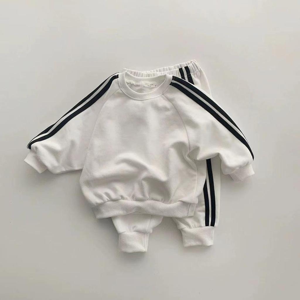 This delightful unisex baby sweatshirt and pants set is perfect for keeping your little one cozy during the transitional seasons of autumn and spring. Crafted from soft, high-quality cotton, the set features a long-sleeved sweatshirt and matching pants. Both pieces are designed in a solid color with stylish webbing stripe patchwork that adds a touch of flair. Comfortable and versatile, this set is ideal for any baby's wardrobe.