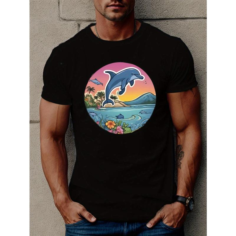 European Size Dolphin Jumps Print T Shirt, Tees For Men, Casual Short Sleeve T-shirt For Summer