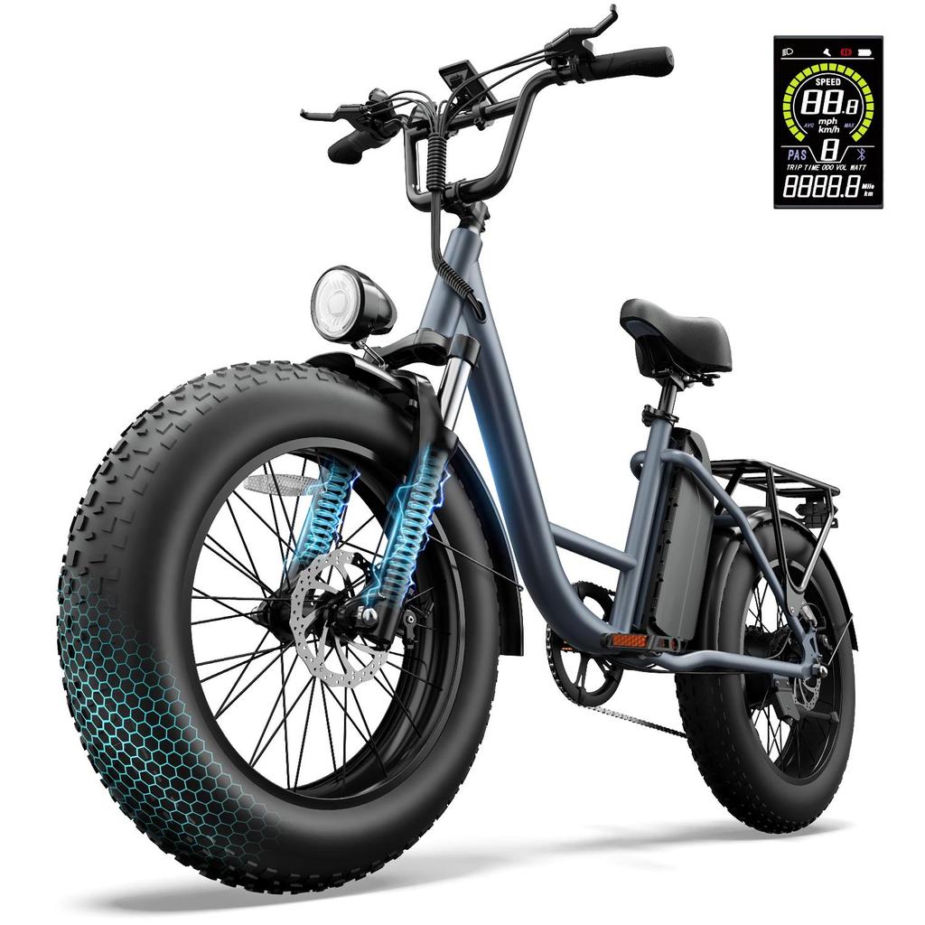 Enjoy a smooth, customized ride. The 20*4.0 inch fat tires and front shock absorption fork provide stability and comfort on city streets, soil, or sand. With an adjustable seat and handlebar, this comfort electric bike perfectly fits riders from 165-185cm.