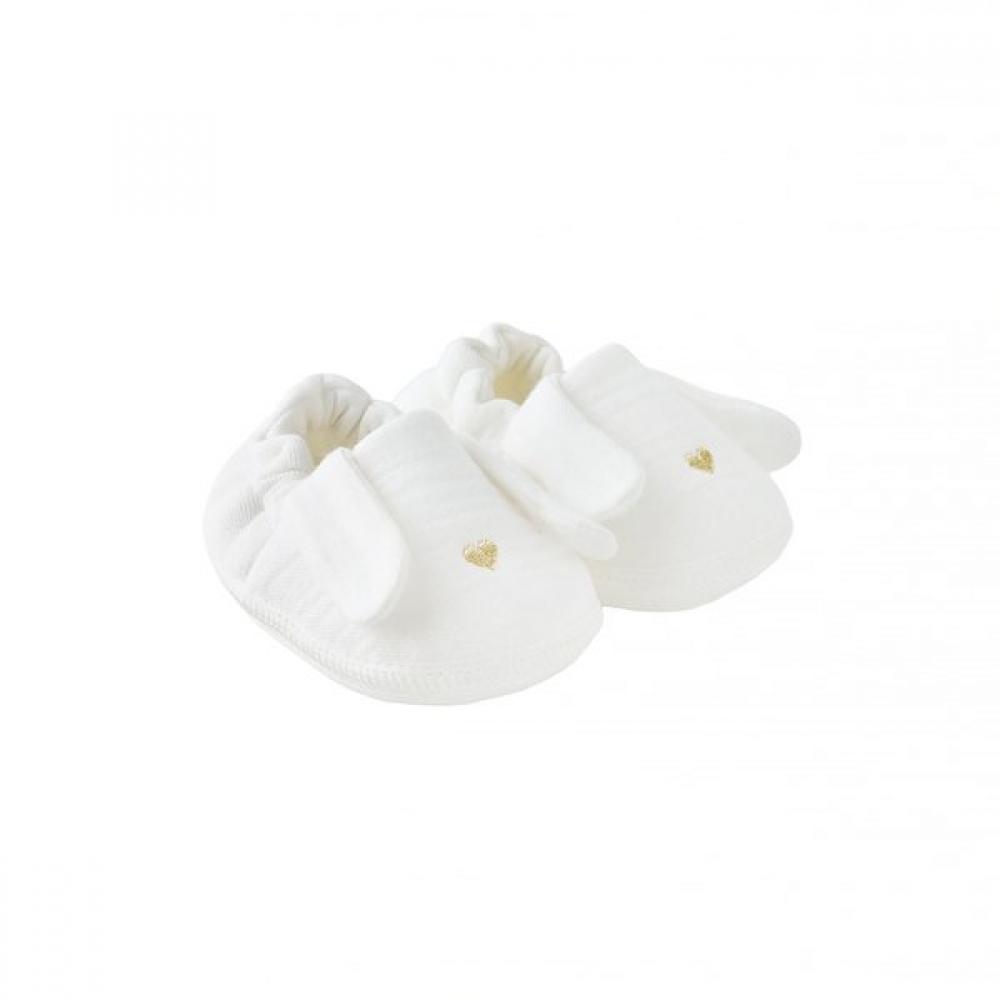 The Minkyu Lulu Gauze Non-slip Socks are designed with cute 3D bunny ears for added charm. The bunny's nose is expressed through golden heart embroidery, enhancing its adorableness. This product is designed for infants and suitable for comfortable indoor wear.