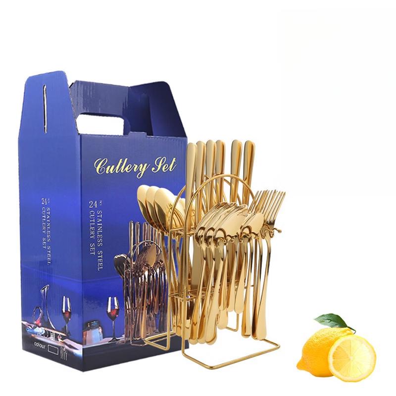 Xihe Gold 24-Piece Bamboo Handle Cutlery Set with Rack