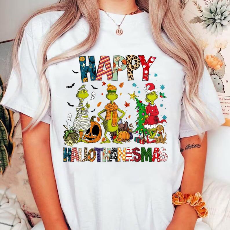 Grinch Halloween Thanksgiving Christmas Shirt, Happy Hallothanksmas Grinch Shirt Unisex T-Shirt