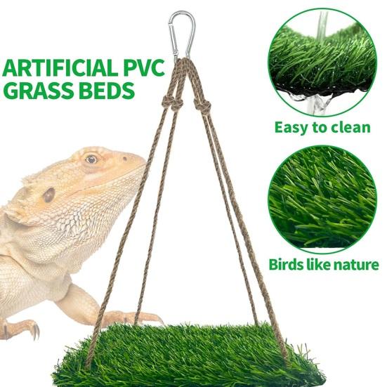 Yapay çim ve sicim bağlantılarından üretilen bu hamak, dayanıklılık ve deformasyona karşı direnç için güçlendirilmiş panellere sahiptir. Temizliği ve bakımı kolaydır, uzun ömürlü kullanım sağlar. Sürüngenleriniz bu konforlu dinlenme ve aktivite platformunu çok sevecek.