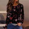 Women's Fashionable Long-Sleeved Round Neck Top with Slit Hem and Valentine's Day Heart Print