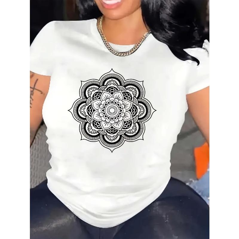 European Size Plus Size - Plus Size Women'S for Lotus Flower Print T-Shirt - Casual Round Neck, Short Sleeve Top in White with Black Mandala Design