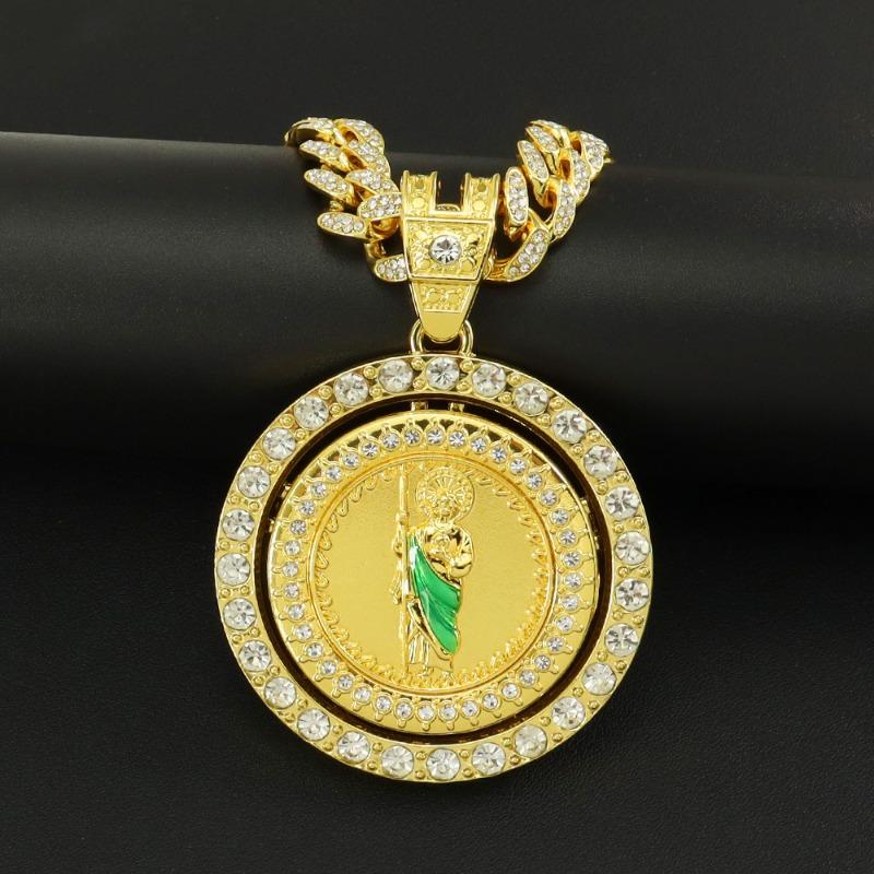 Hip Hop Tide Men's and Women's Diamonds Rotatable Religious St. Jude Statue Pendant Cuban Chain Necklace Accessories