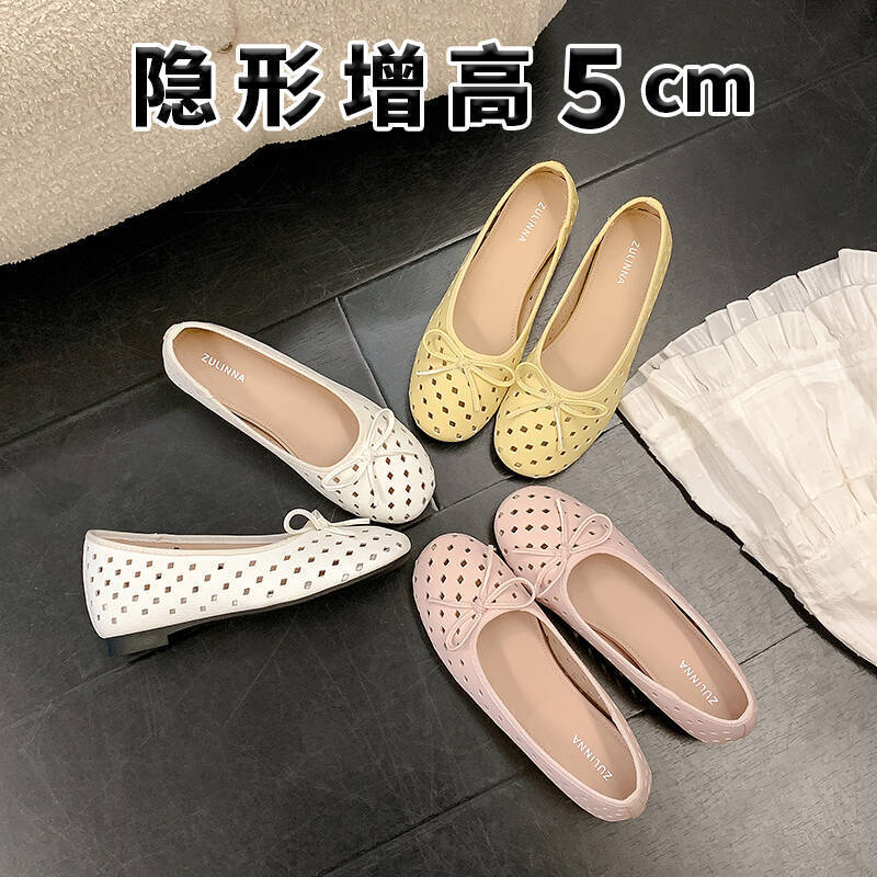 French inner heightening hollow shallow mouth single shoes women's breathable casual bow versatile sandals grandma shoes